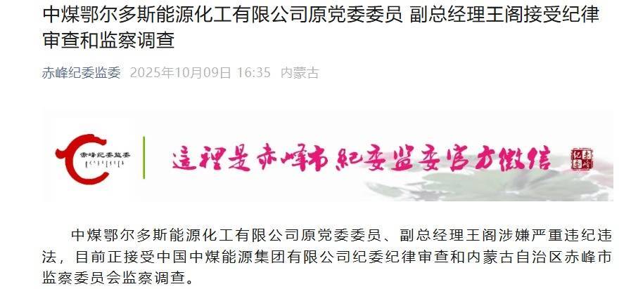 中煤鄂尔多斯能源化工有限公司原党委委员、副总经理王阁涉嫌严重违纪违法,目前正接受中国中煤能源集团有限公司纪委纪律审查和内蒙古自治区赤峰市监察委员会监察调查。